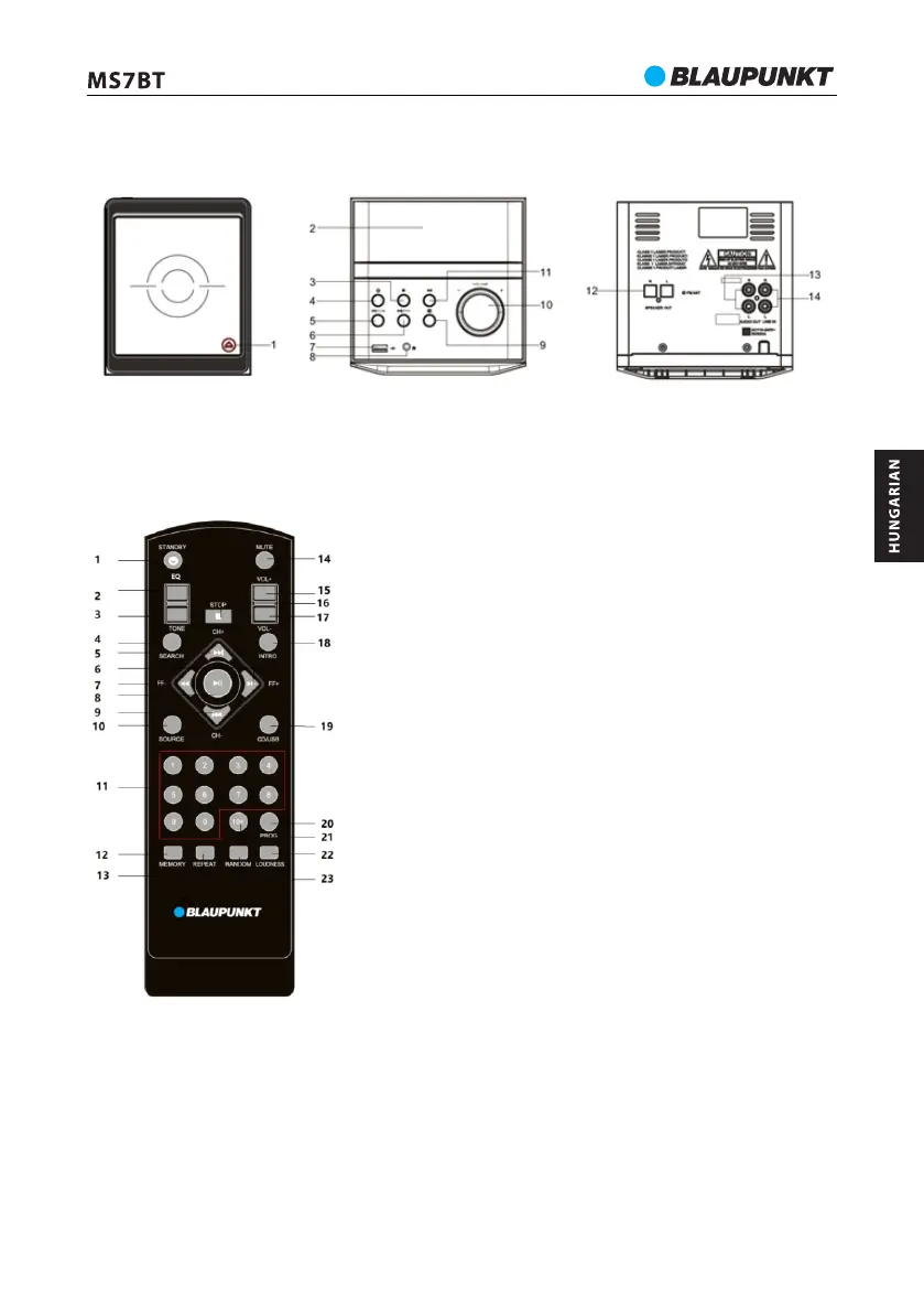 5—előző / rádióállomás -; 6—következő / rádióállomás +; 7—USB-aljzat ; 8—fejhallgató csatlakozó;