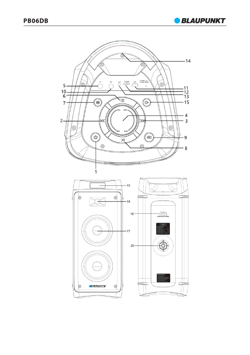 12 — microSD ligzda; 13 — AUX IN ieeja; 14 —Rokturis; 15 —Skaņas izslēgšana;
