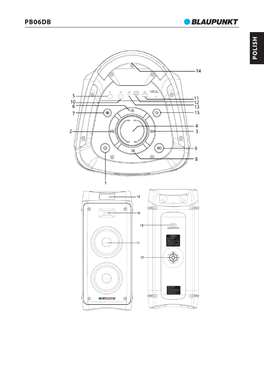 microSD; 13- Wejście AUX IN; 14- Rączka; 15- Wyciszenie;