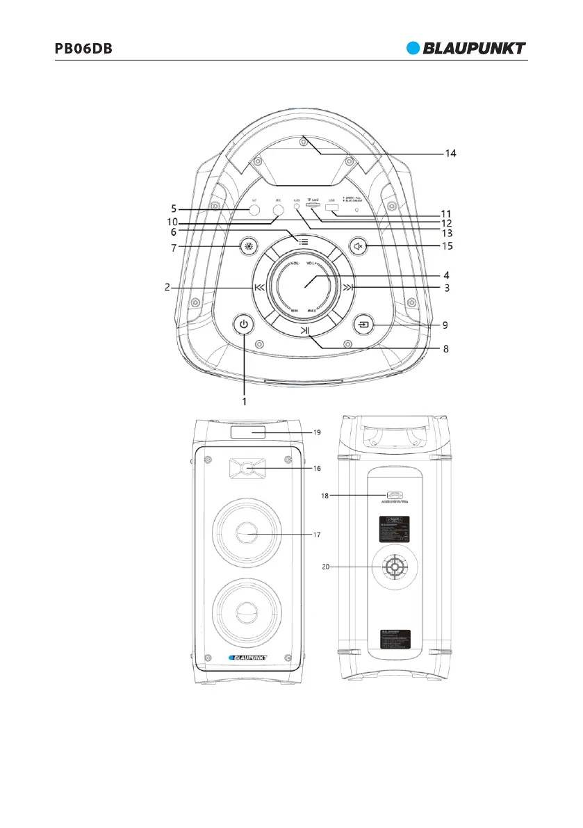 15- Tipka za prioritet mikrofona; 16- Visokotonski zvučnik; 17- Srednje-niskotonski zvučnik;