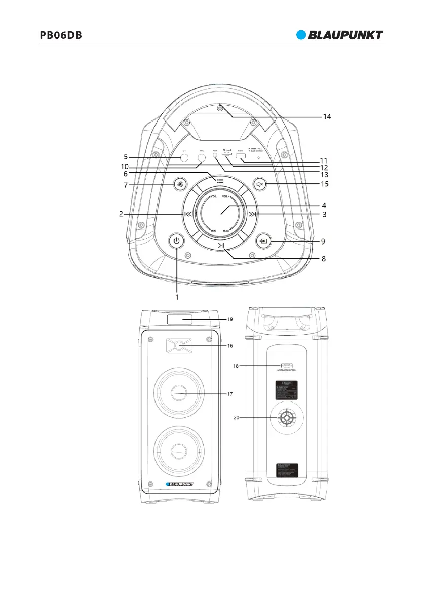 12 - Гнездо microSD; 13 - Вход AUX IN; 14- Дръжка; 15 - Изключване на звука;