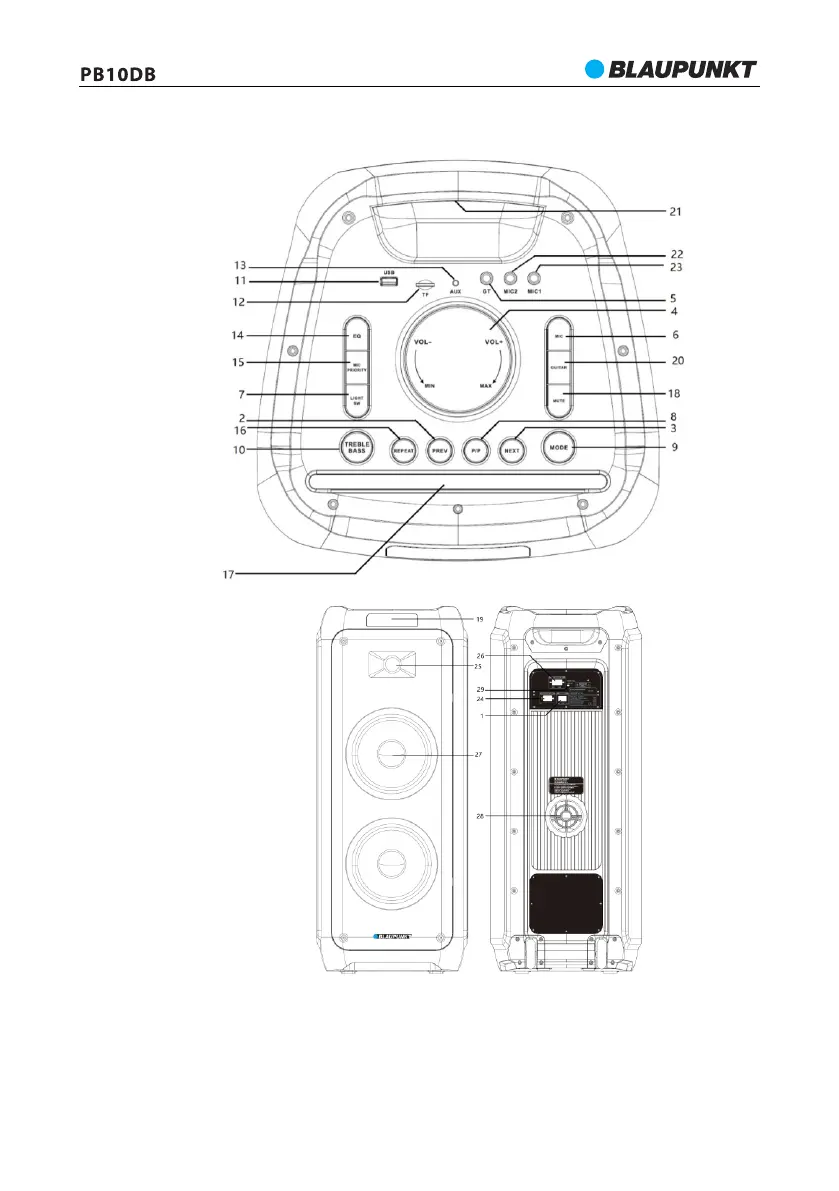 26- Välise toiteallika terminal 12V DC; 27- Keskmiste-madalate toonide kõlar; 28- Port Bass-Reflex;