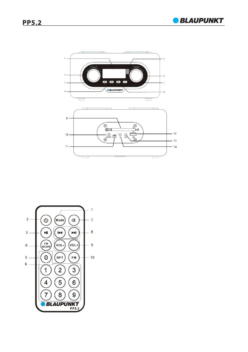 7- Tryb odtwarzania 8- Przycisk “następny” 9- Antena FM