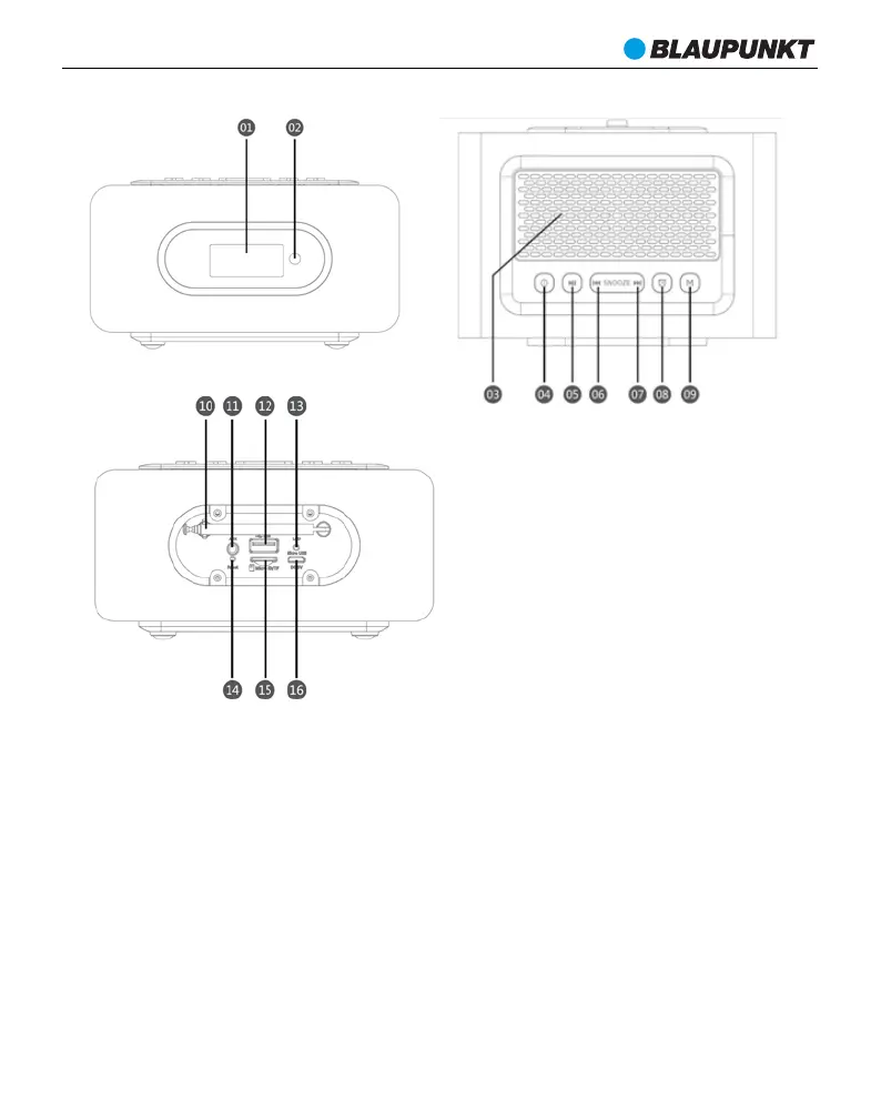 08 – Kella nupp. 09 - USB / microSD / FM / AUX IN taasesitamise režiimi nupud.