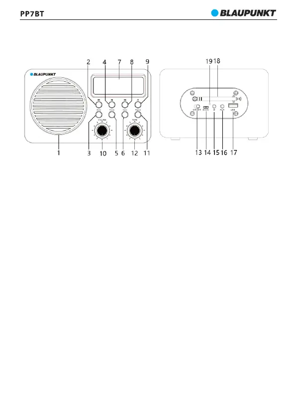 14- Napajalna vtičnica DC 5V; 15- Vtičnica za slušalke; 16- Vhod AUX-IN;