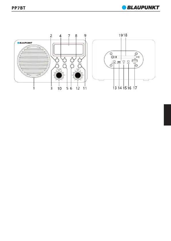 4- Tastă “redare/pauză”; 5- Tastă memorie stație; 6- Tastă alarmă;