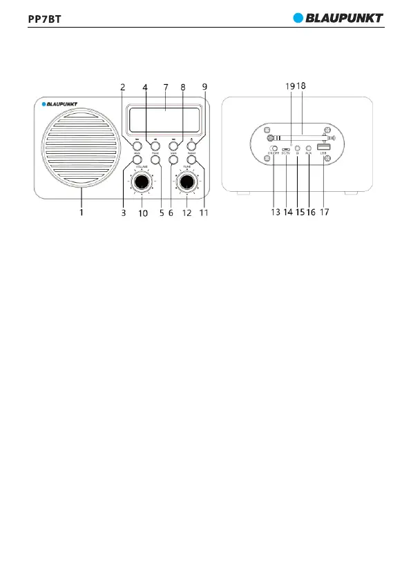 16- AUX-IN sisend; 17- USB pesa; 18- Toite ja laadimise LED näidik;