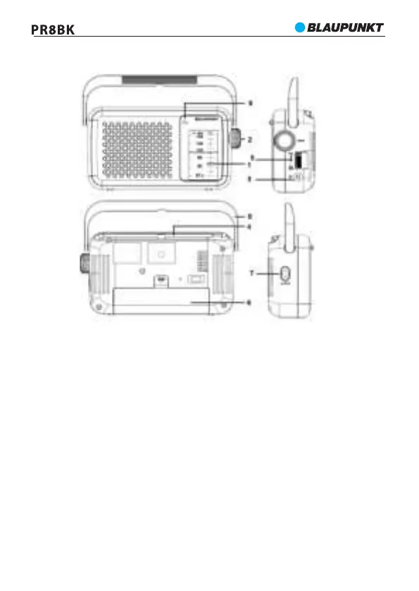 1- Честотна лента, 2- Въртящ бутон за настройка, 3- Изход за слушалки, 4- Антена