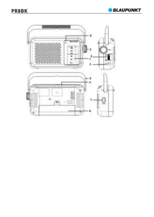 1 - Dažnių skalė, 2 - Derinimo ratukas, 3 - Ausinių išvestis, 4 - Antena
