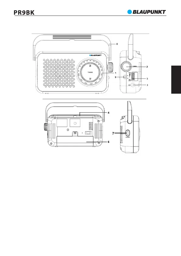6- Az elemtartó rekesz, 7- AC csatlakozóaljzat, 8- Fogantyú,