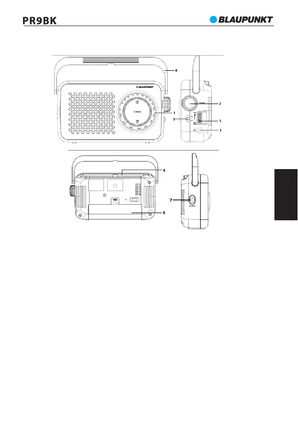 1 - Scara de frecvențe, 2 - Buton rotativ de reglare, 3 - Ieșire căști, 4 - Antenă