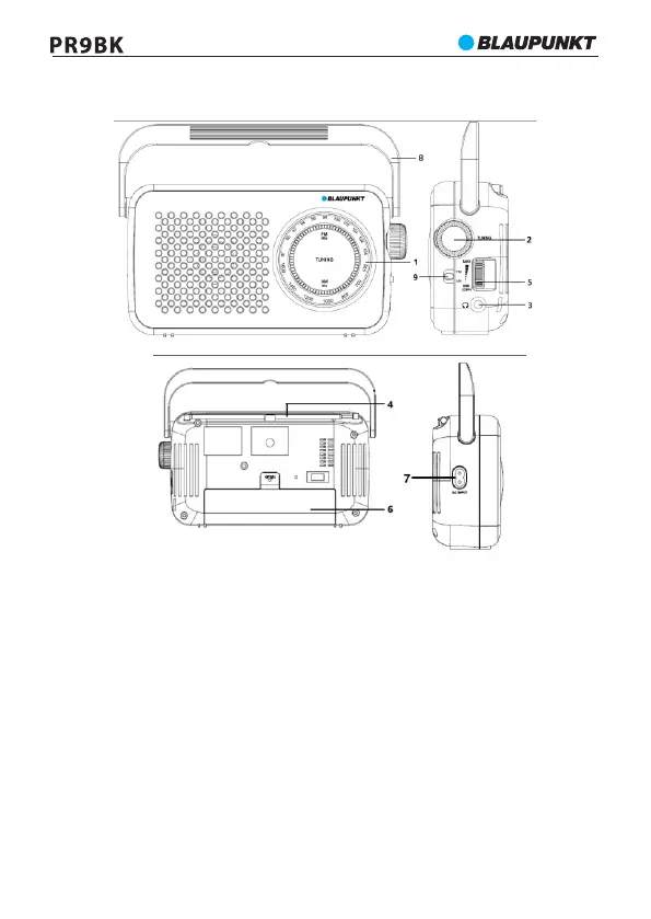 potentiometer; 6-Battery compartment; 7-AC power outlet; 8-Handle; 9-AM/FM tuner
