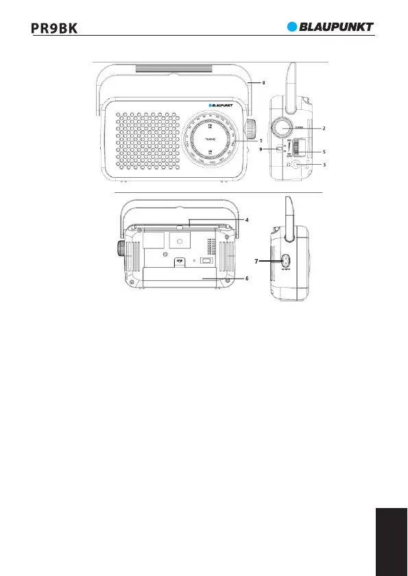7- Električna vtičnica, 8- Ročaj, 9-Stikalo za izbiro razpona FM/AM
