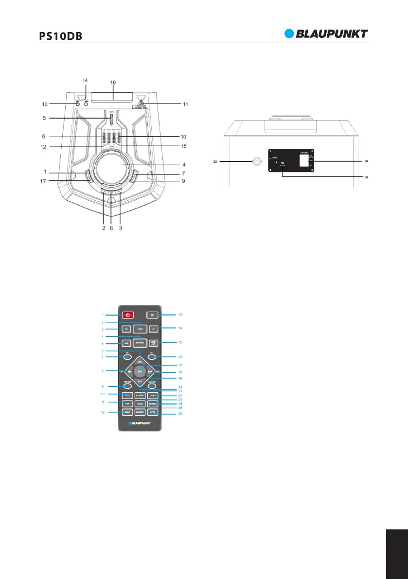10, 11, 21, 22, 23, 25 – Tipke načina EQ (Jazz/POP/Classic/Flat/Rock/Country)