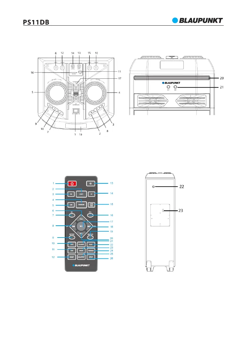 20- Osvětlení Disco; 21- Vstup mikrofonu 1 I 2; 22- Vstup antény FM; 23- Zásuvka napájecího kabelu AC;