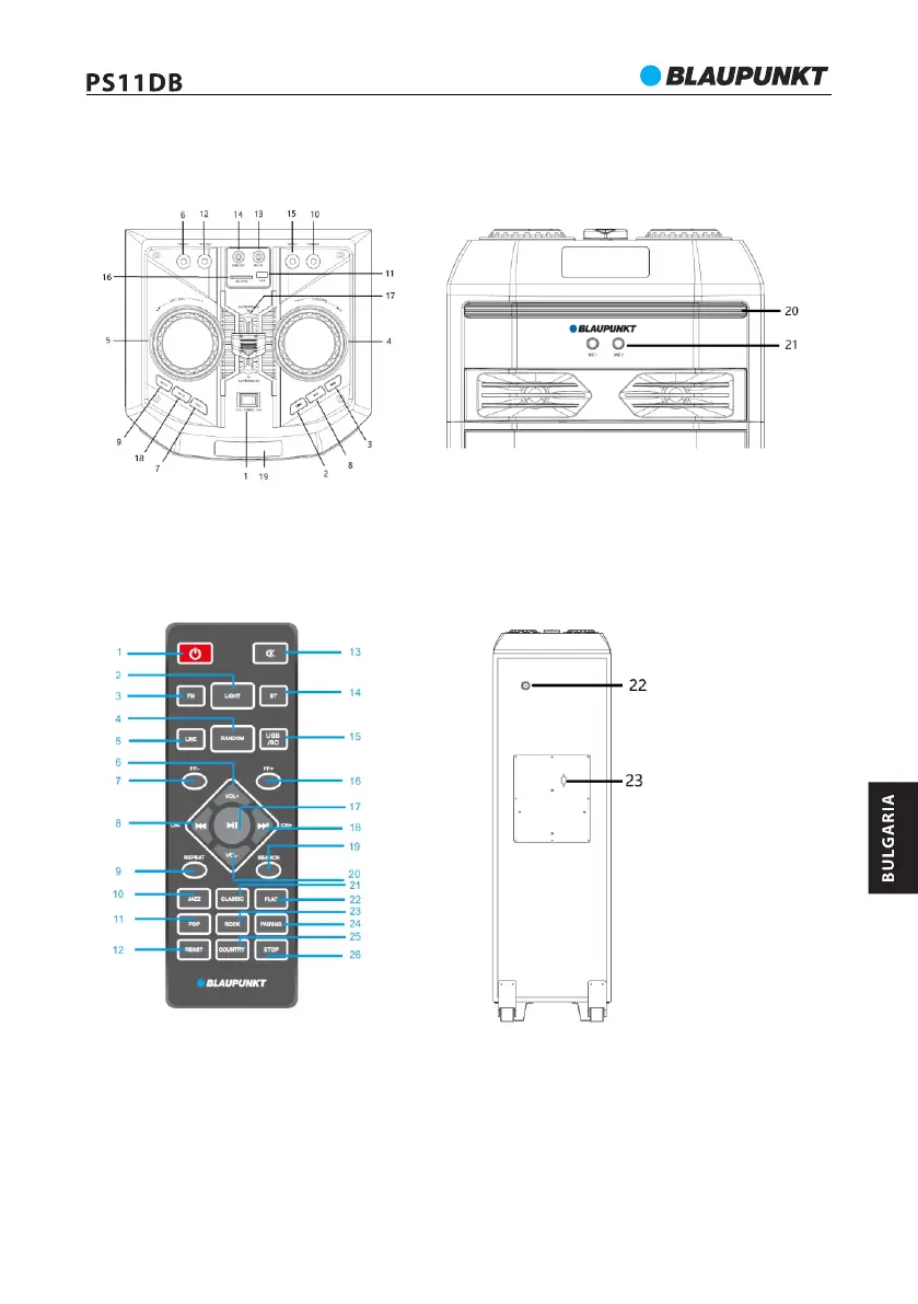 20 - Осветление Disco; 21 - Гнездо за микрофон 1 и 2; 22- Гнездо за антена FM;