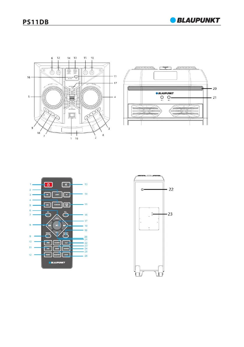14- Έξοδος σήματος audio LINE OUT;16- Υποδοχή καρτών SD card;17- Λειτουργία Super bass; 18- Σίγαση;