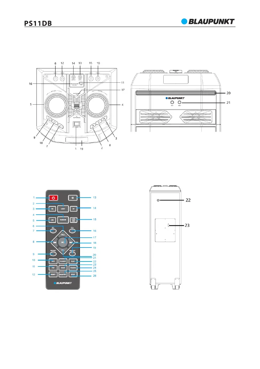 21- 1 ir 2 mikrofono lizdas; 22 - FM antenos lizdas; 23- Kintamosios srovės (AC) maitinimo laido lizdas;