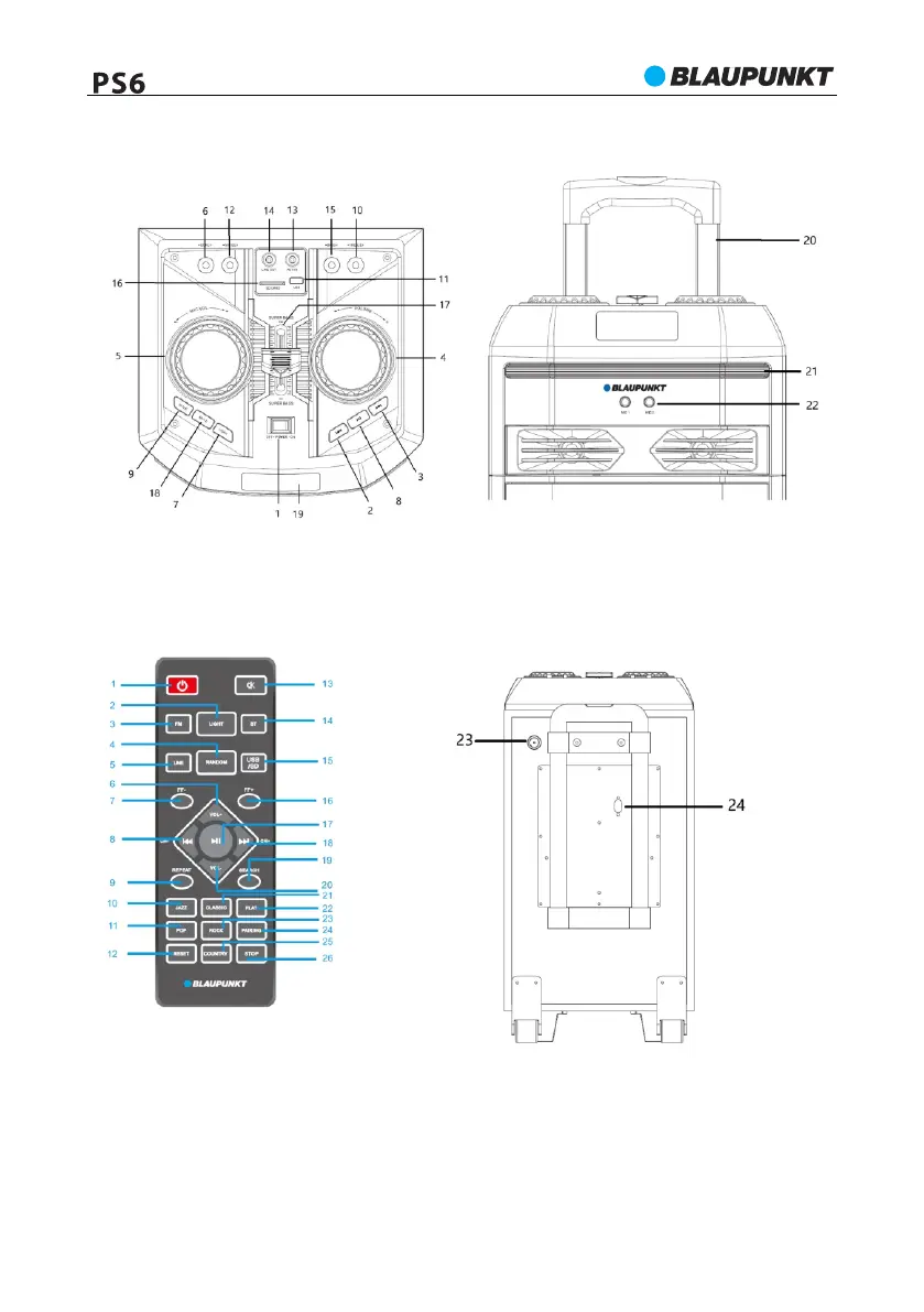 22- Gniazdo mikrofonu 1 I 2; 23- Gniazdo anteny FM; 24- Gniazdo przewodu zasilania AC;