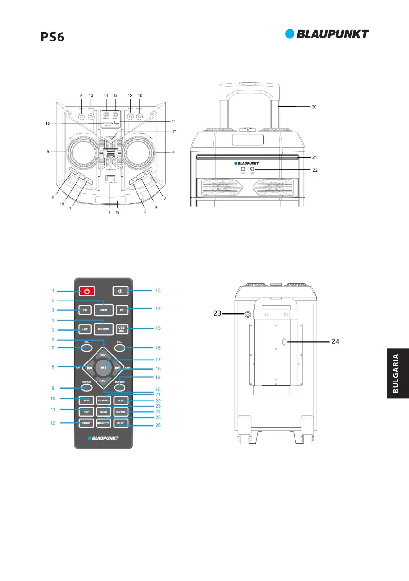 21 - Осветление Disco; 22 - Гнездо за микрофон 1 и 2; 23 - Гнездо за антена FM;
