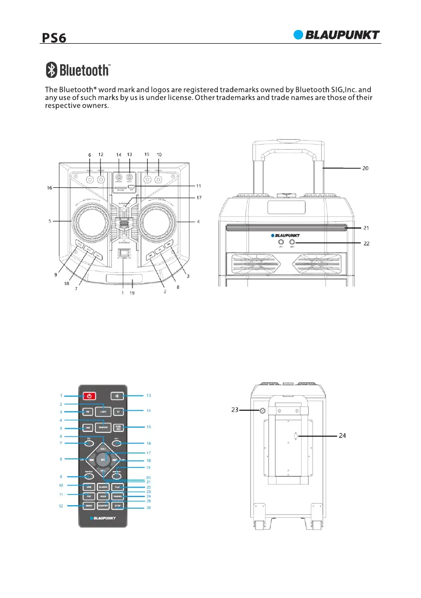 19- Display; 20- trolley handle; 21- Disco light window; 22- micro phone 1 and 2 input jack;