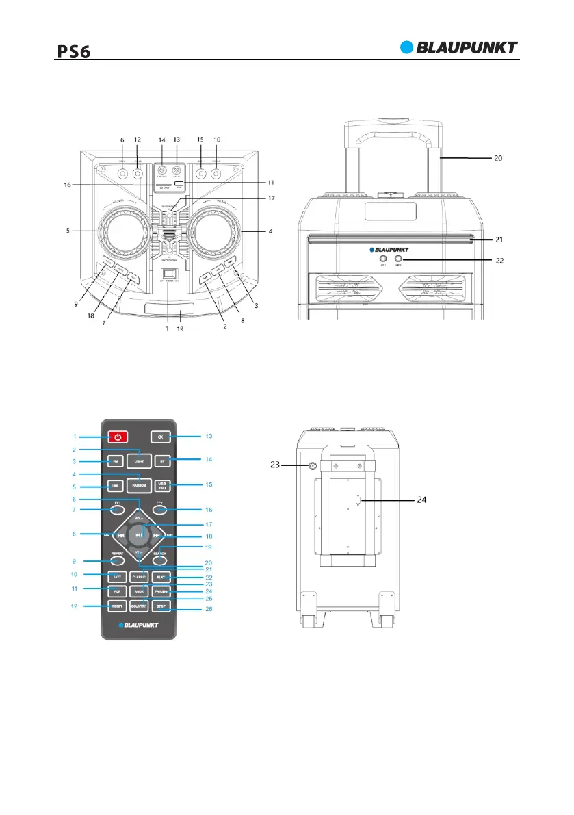 21- Disco apšvietimas; 22- 1 ir 2 mikrofono lizdas; 23 - FM antenos lizdas;