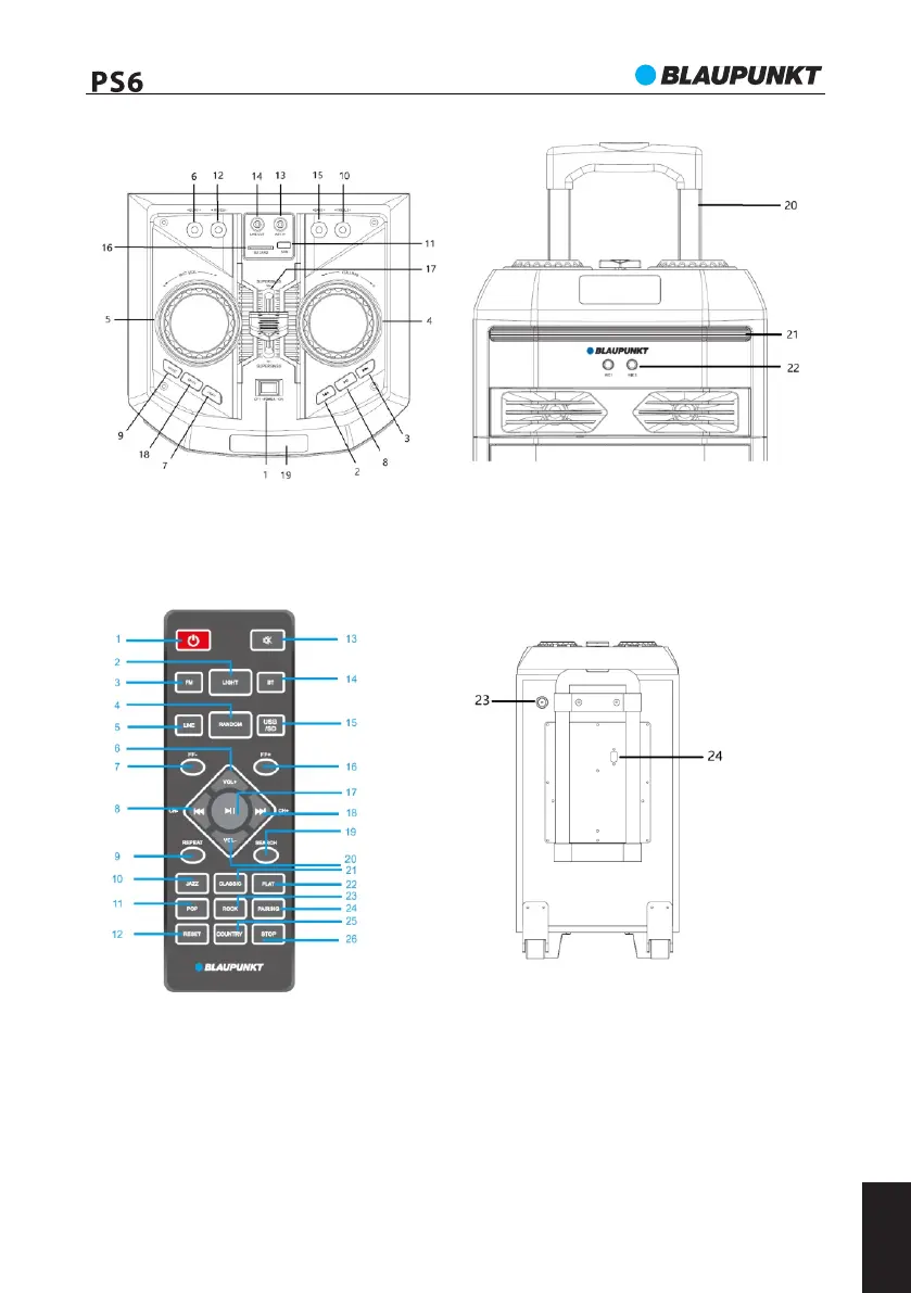 19- Prikazovalnik; 20- Ročica; 21- Osvetlitev Disco; 22- Vtičnica mikrofona 1 I 2; 23- Vtičnica za FM-anteno;