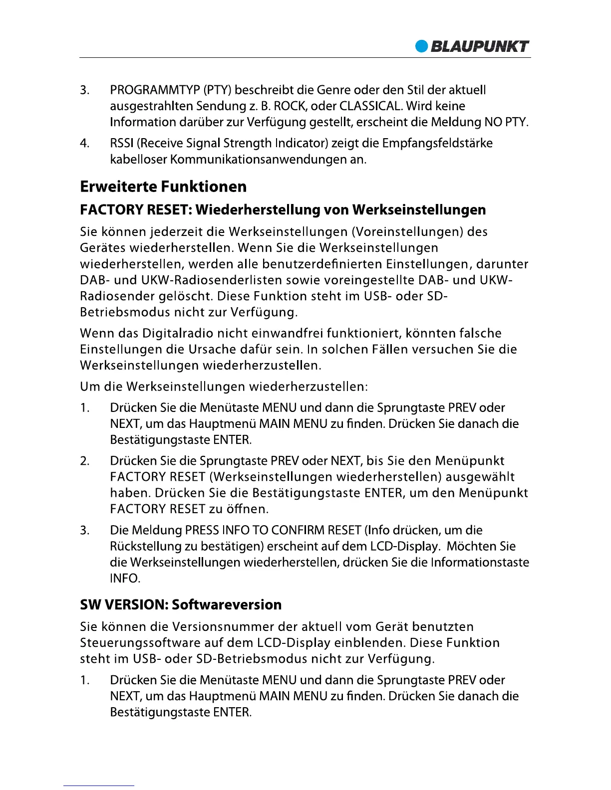 Blaupunkt RX+ 35e - Advanced Features and Settings; Factory Reset Procedure
