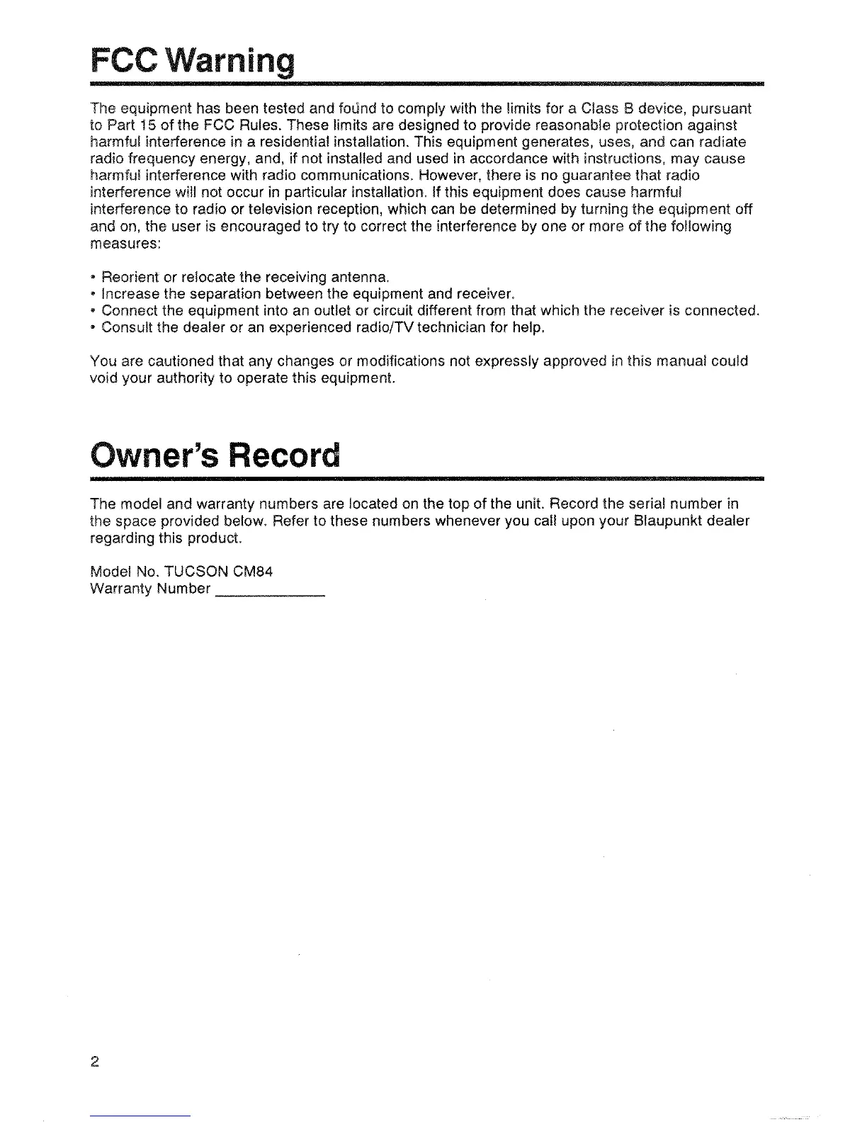 Blaupunkt Tucson CM84 - FCC Warning Information; Owners Record Details