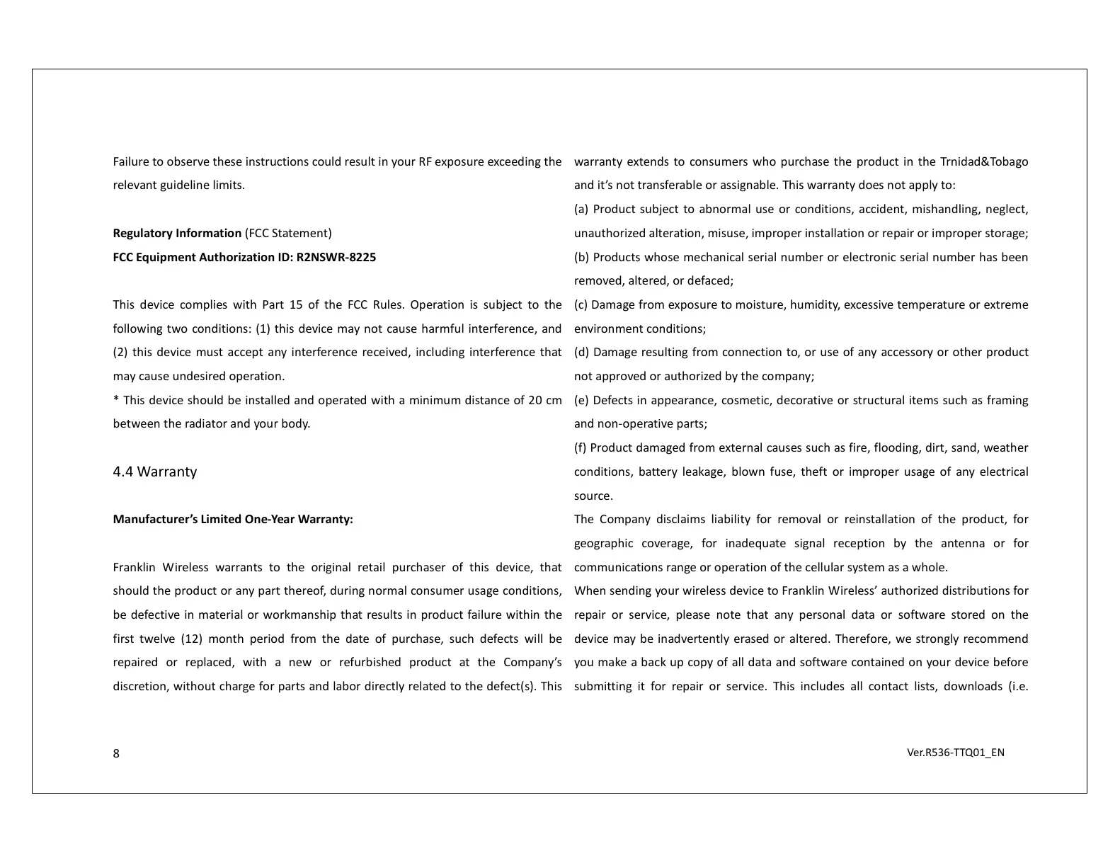 Franklin Wireless warrants to the original retail purchaser of this device, that