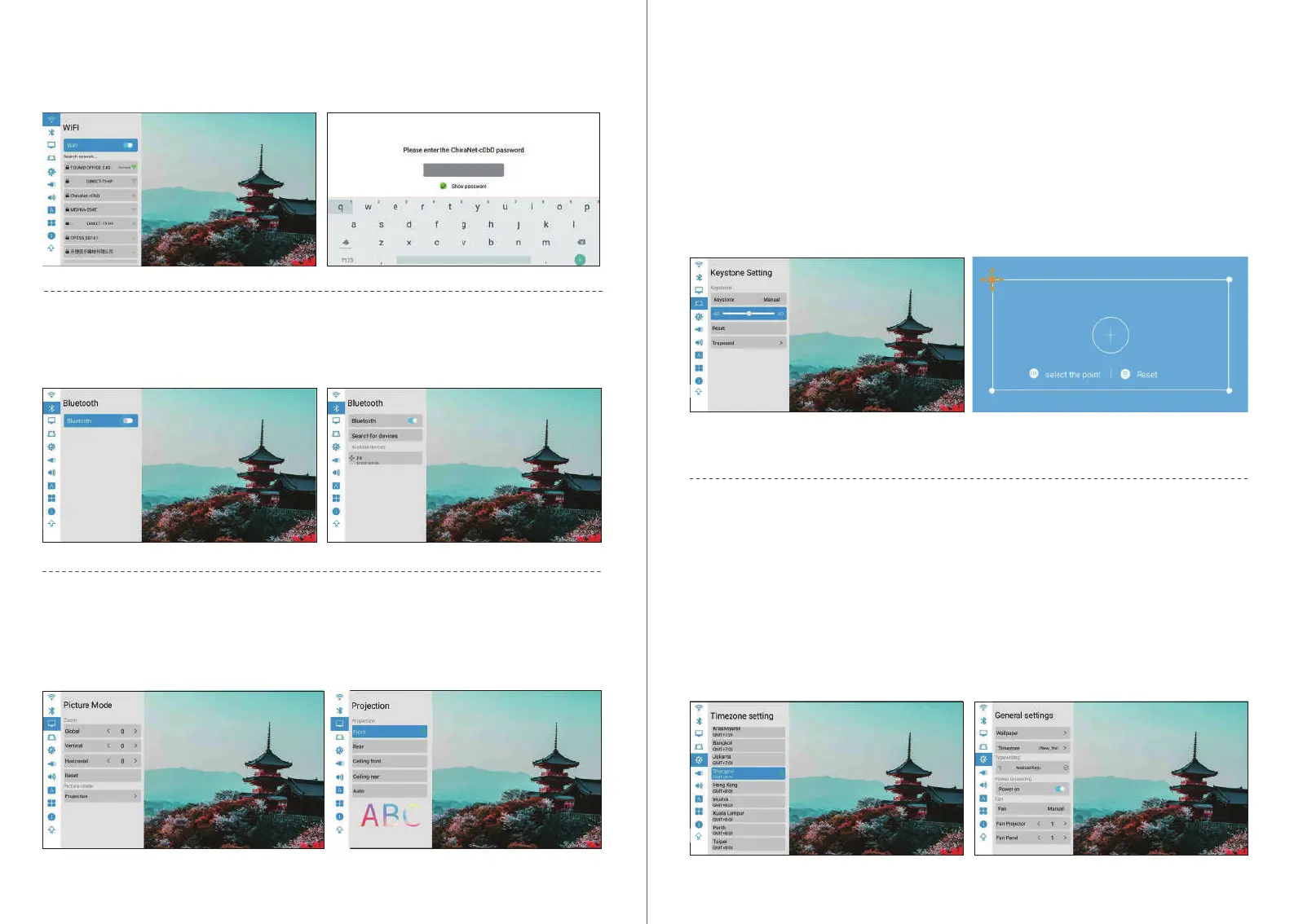 1.Projection mode: Front/Rear/ Ceiling front/Ceiling rear/Auto.