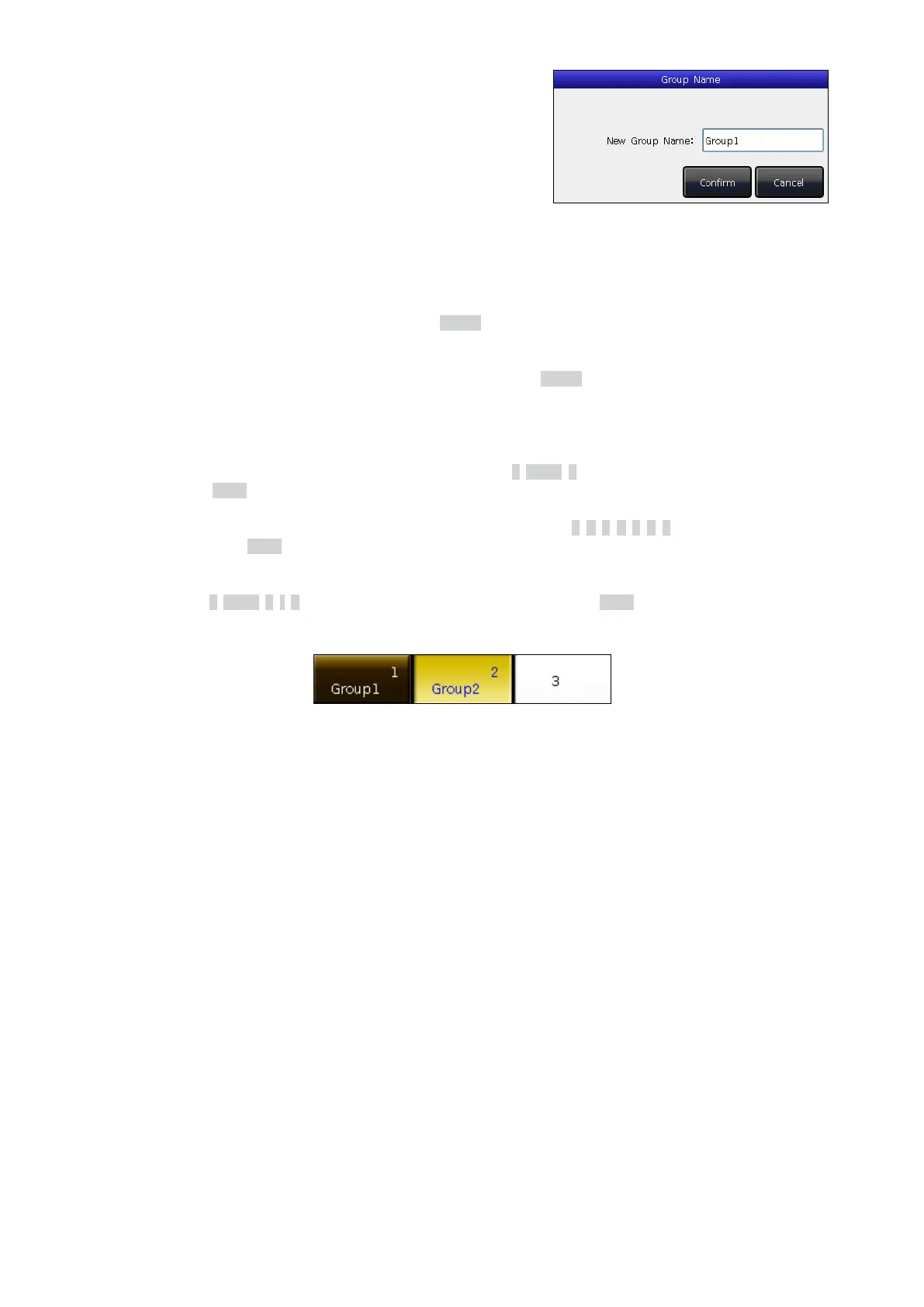 press keys in order as 1, THRU, 5, -, 3. The touch screen will display 1~5-3. Press the Enter key to select those groups.