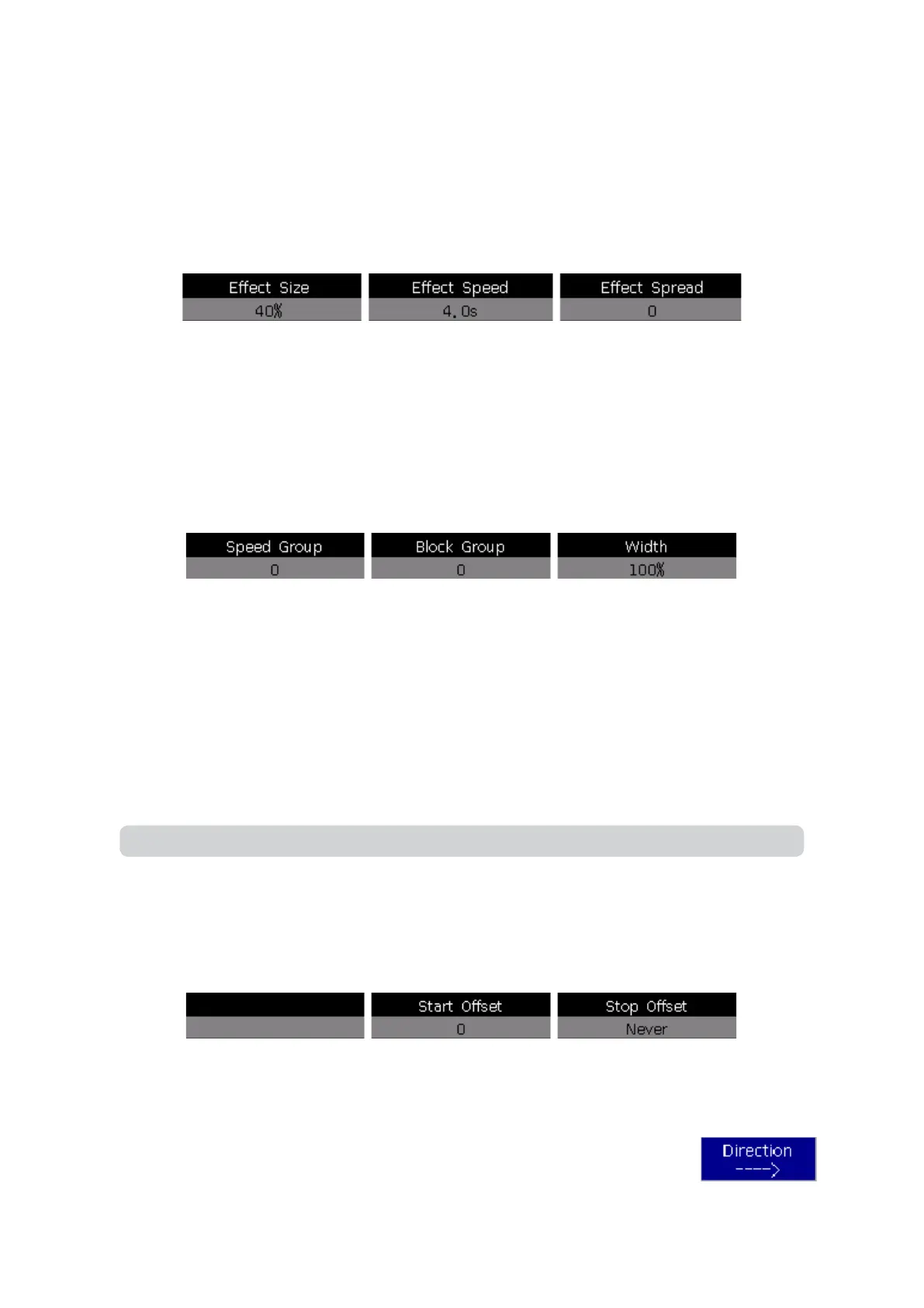 The [Eect Direction] can run eects in dierent directions as: →, ←, ‘←.→’ or ‘→.←’.