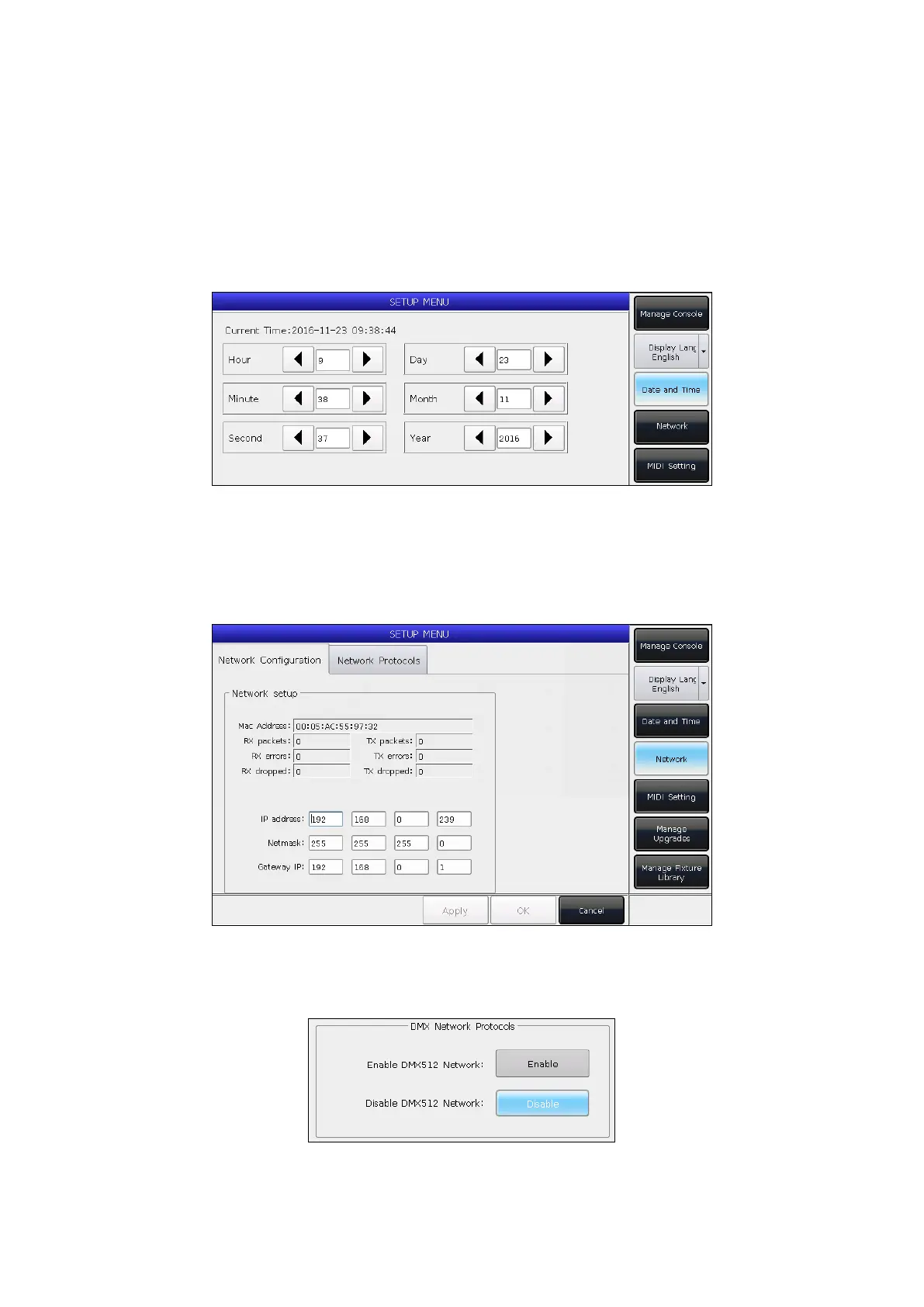 1. Network Conguration: You can setup the network conguration for output on the controller. The default IP
