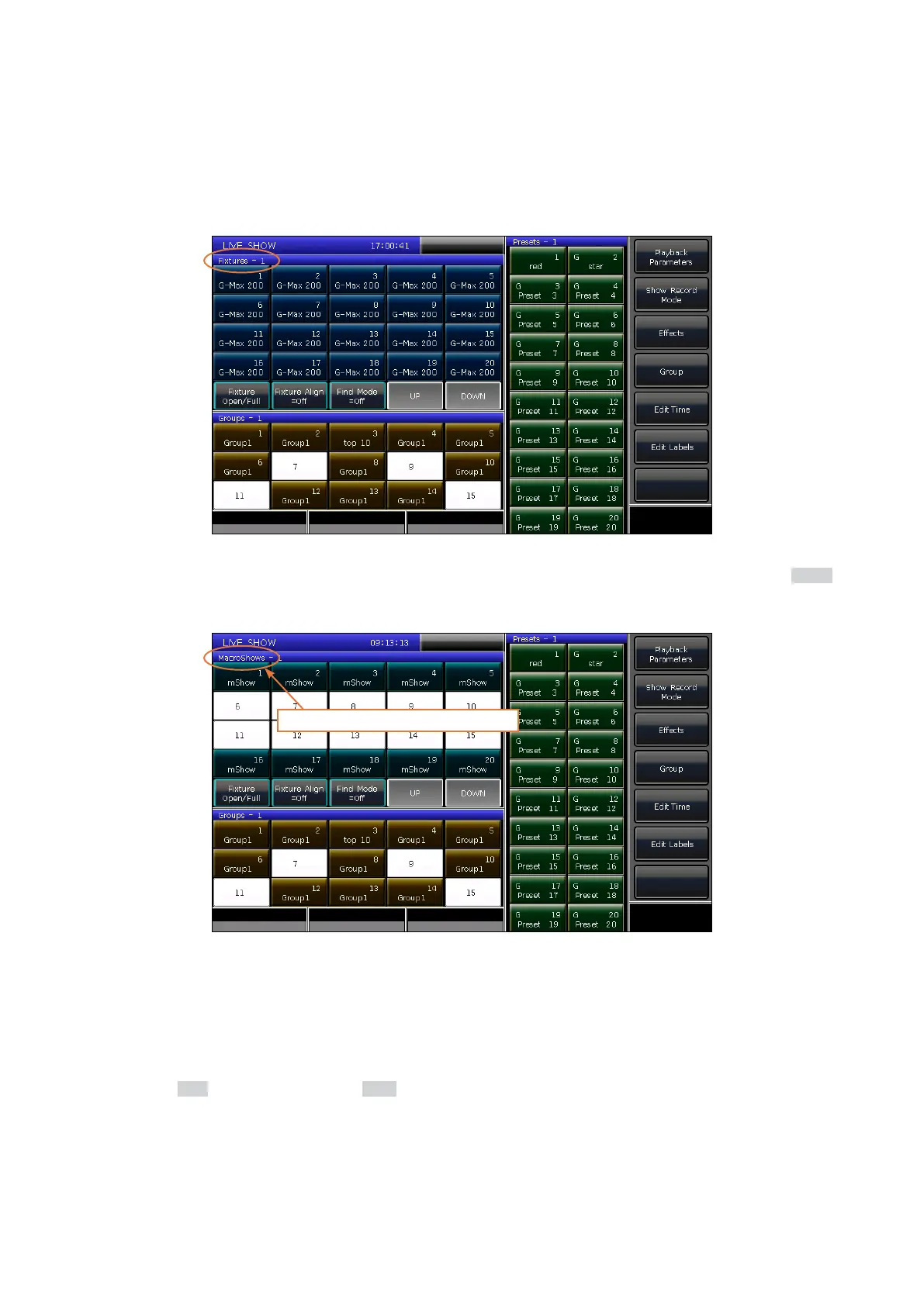 key and touch the heading name Fixtures on the blue bar, you will then see MacroShows.