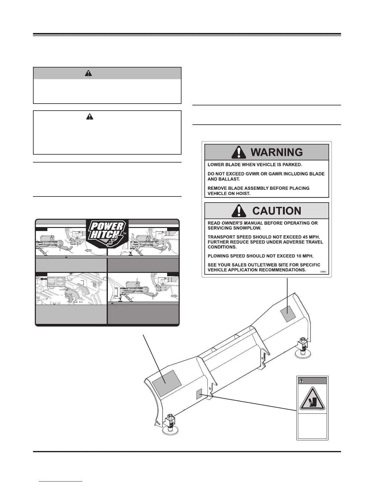 WARNING: Keep fingers away. POWER HITCH arm raises behind undercarriage pushbeam.