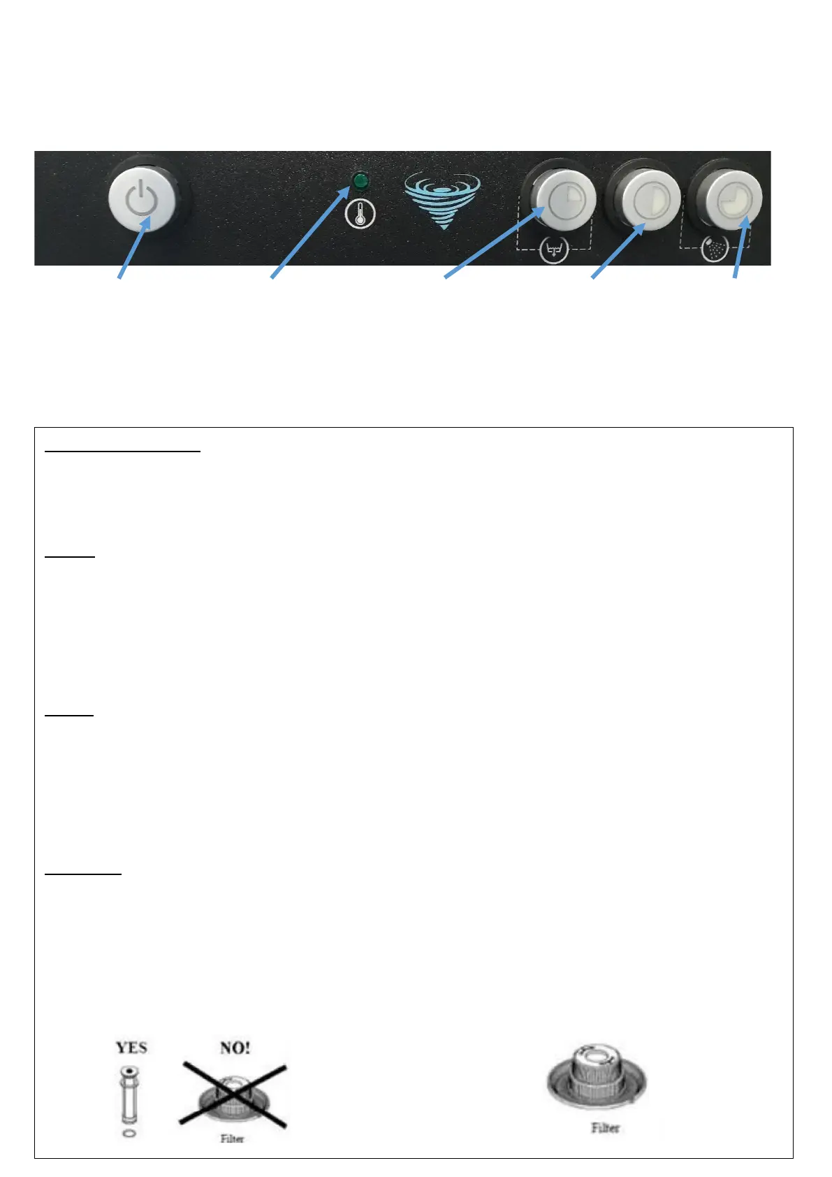 The machine fills up and stops when full and heats up, switch on ½ hr before first use, when