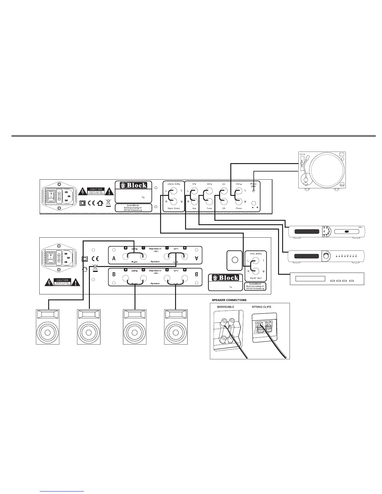 Block A 100 - Connecting the Amplifier; Pre-Amplifier Connection Diagram; Power-Amplifier Connection Diagram; Speaker Wiring Guide