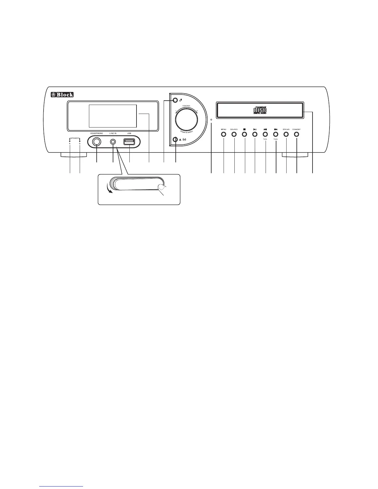 11. SOURCE KEY: PRESS TO SELECT PLAY SOURCE WITHIN INTERNET RADIO/MEDIA/DAB/FM/TV/AUX/DVD/PHONO