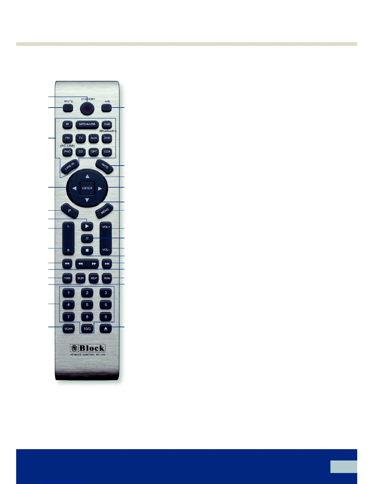 23. Tone: press this key to go to bass / treble/loudness screen, and use