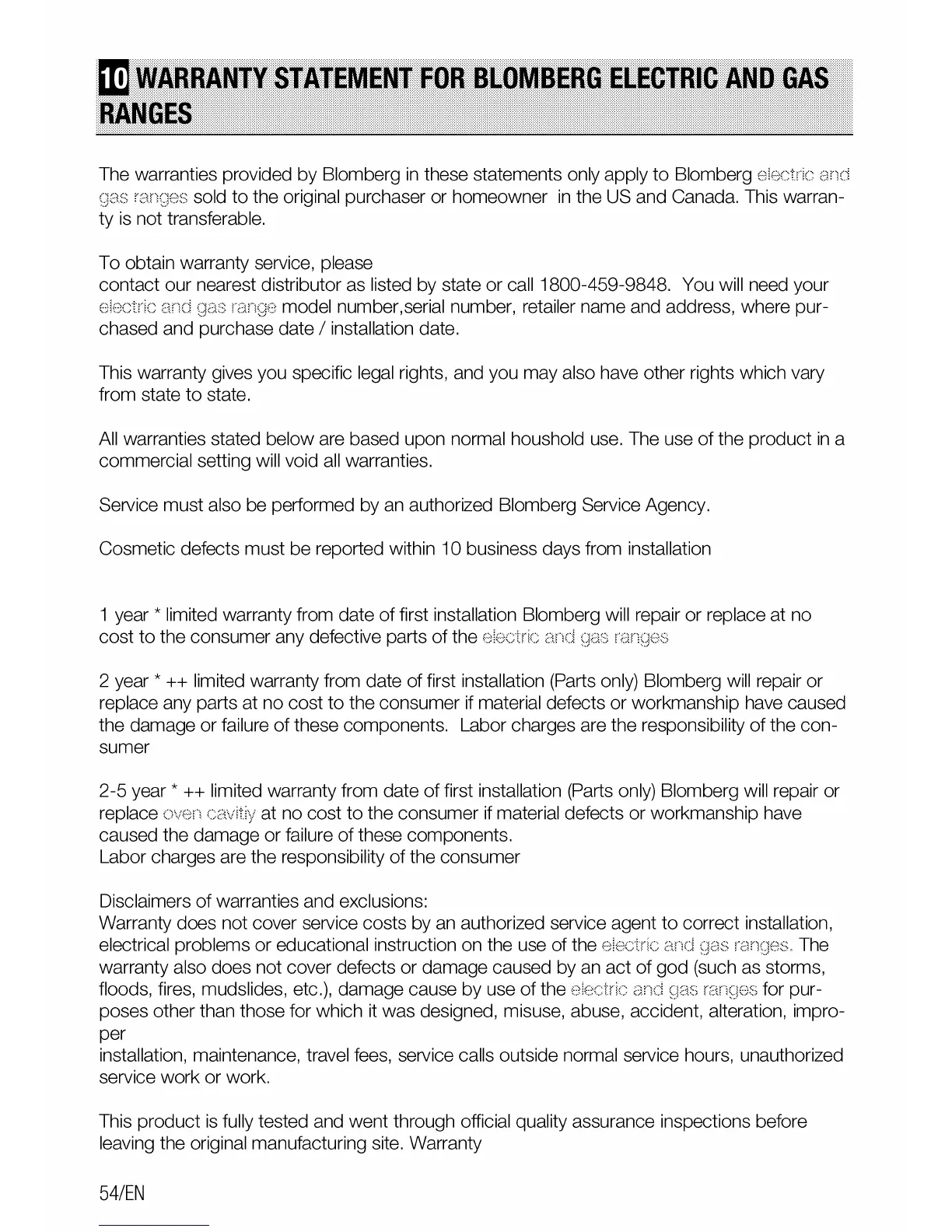 limited warranty from date of first installation (Parts only) Blomberg will repair or