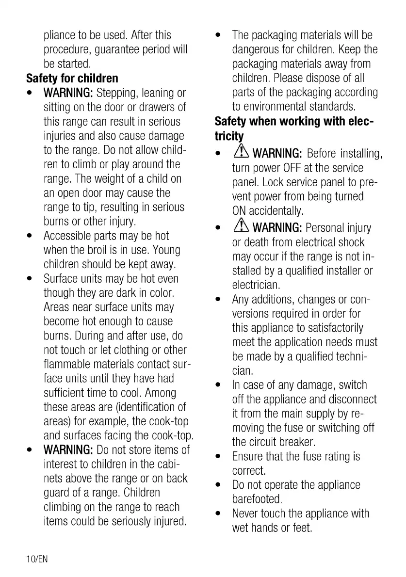 Blomberg BGRP34520CSS - Child and Electrical Safety; Child Safety Warnings and Precautions; Packaging Material Safety and Disposal; Electrical Installation Safety Requirements