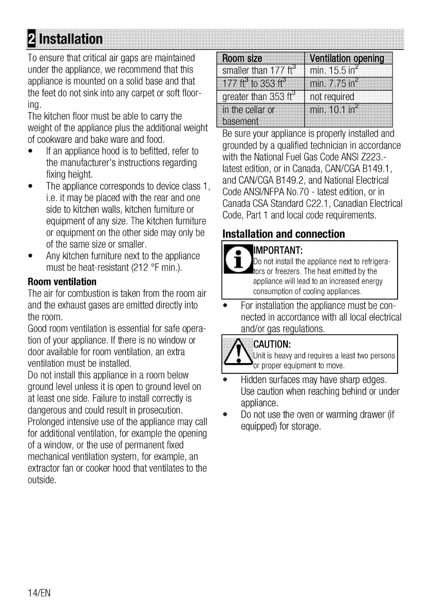 Blomberg BGRP34520CSS - 2 Installation; Appliance Placement and Floor Support; Room Ventilation Requirements for Installation; Installation and Connection Compliance