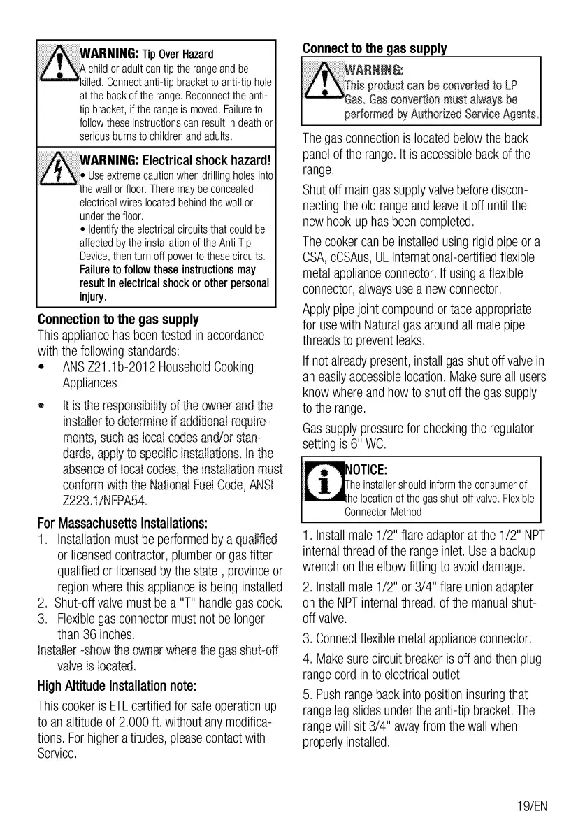 Blomberg BGRP34520CSS - Connecting to the Gas Supply; Gas Supply Connection Standards and Requirements; Massachusetts Gas Installation Rules; Flexible Connector Gas Method