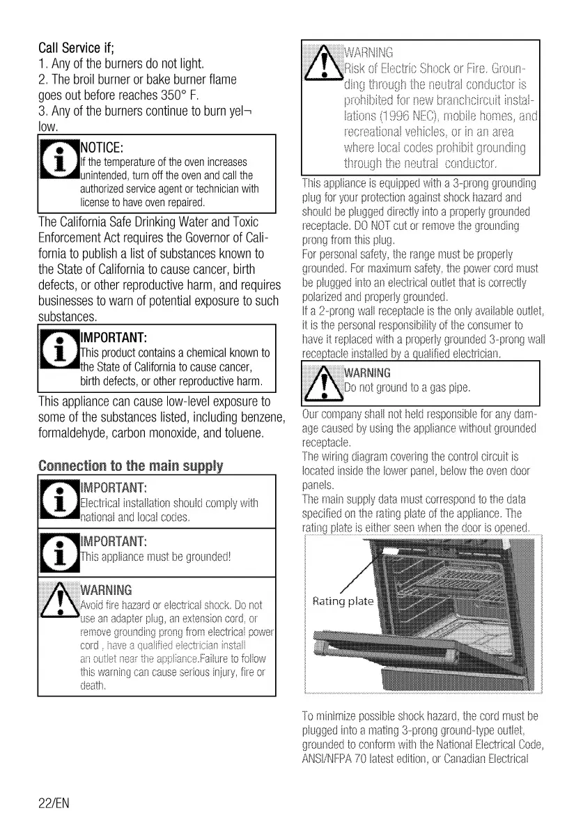 Blomberg BGRP34520CSS - Service Requirements and Electrical Connection; Conditions Requiring Service Calls; Electrical Installation Code Compliance; Critical Grounding Requirements