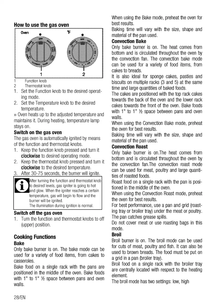 Blomberg BGRP34520CSS - How to Use the Gas Oven; Gas Oven Control Knobs Explanation; Switching On the Gas Oven Burner; Oven Cooking Function: Bake