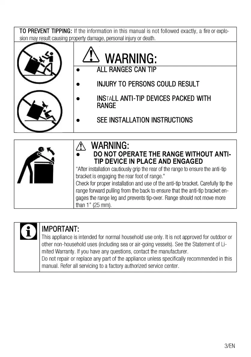 Blomberg BGRP34520CSS - Preventing Tip-Over Hazards; WARNING: All Ranges Can Tip; WARNING: Operate Without Anti-Tip Device; IMPORTANT: Intended Household Use Only