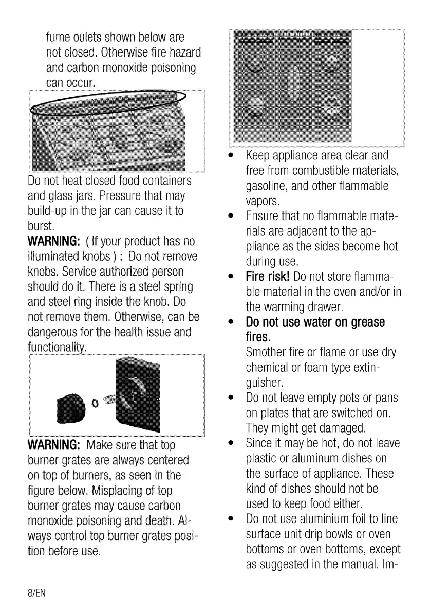 Blomberg BGRP34520CSS - Safe Appliance Area and Material Handling; Food Container and Flammable Material Warnings; Fire Safety and Prevention Measures; Cookware and Lining Material Safety