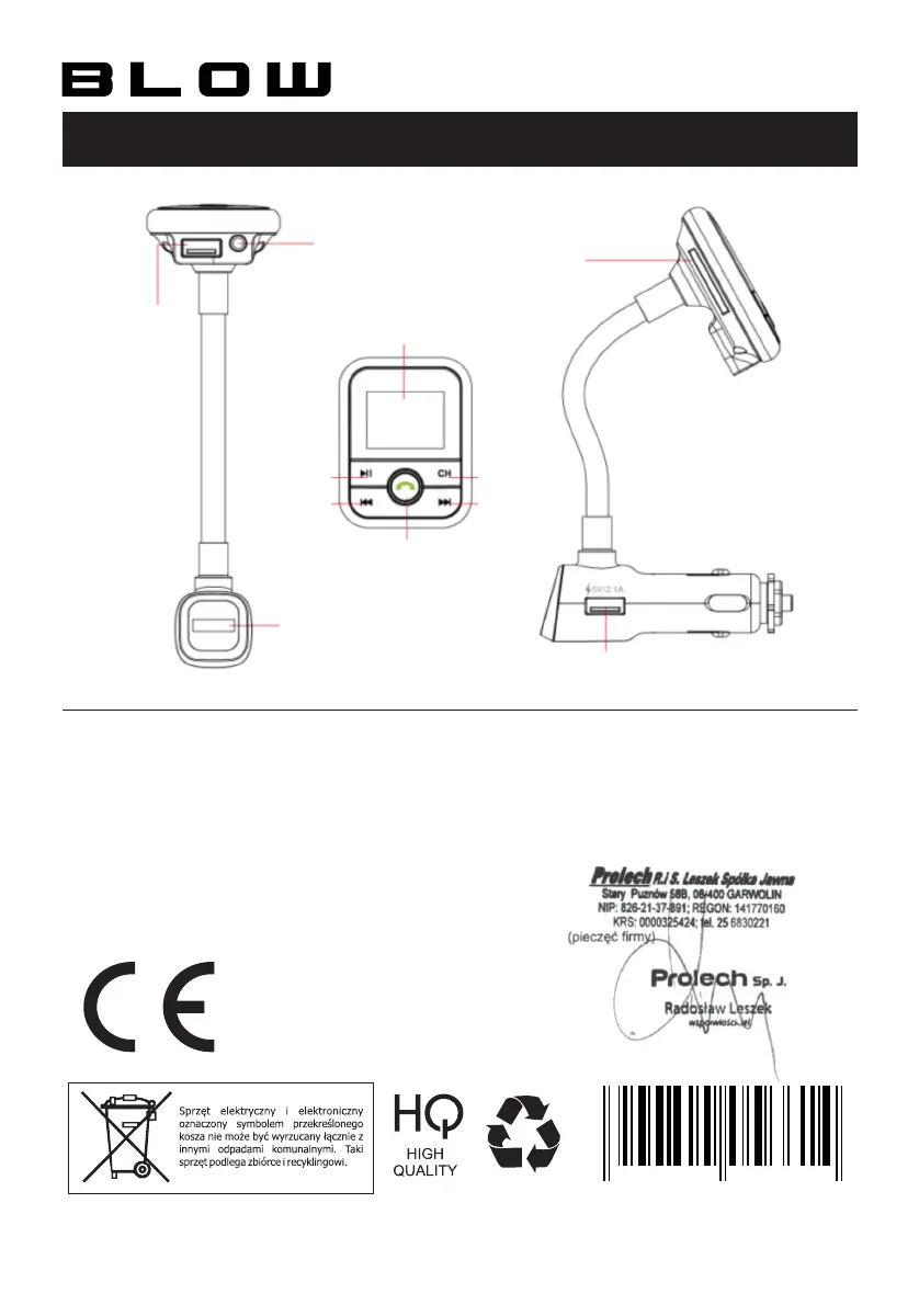 Wyprodukowano w CH.R.L dla firmy PROLECH Sp.J. , Stary Puznów 58B, 08-400 Garwolin, Polska