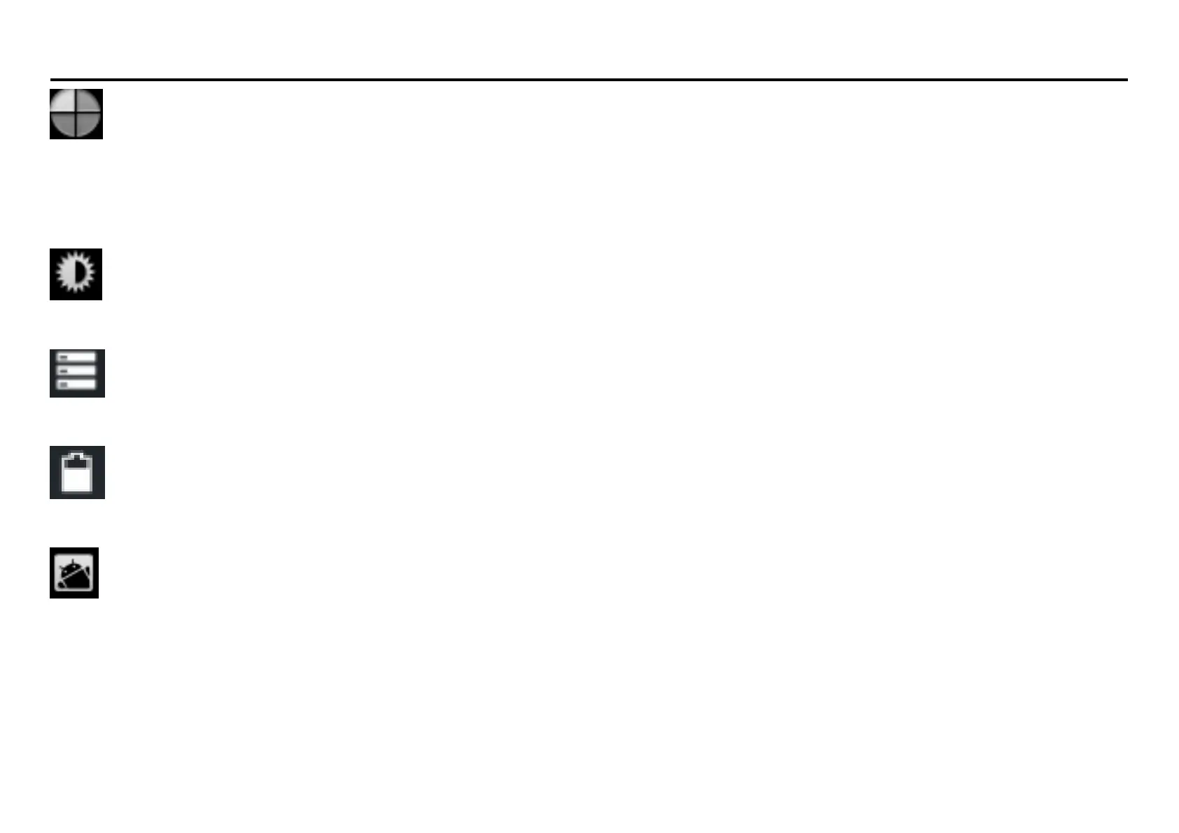 Brightness, Auto rotating screen, Wallpaper, Screen Timeout